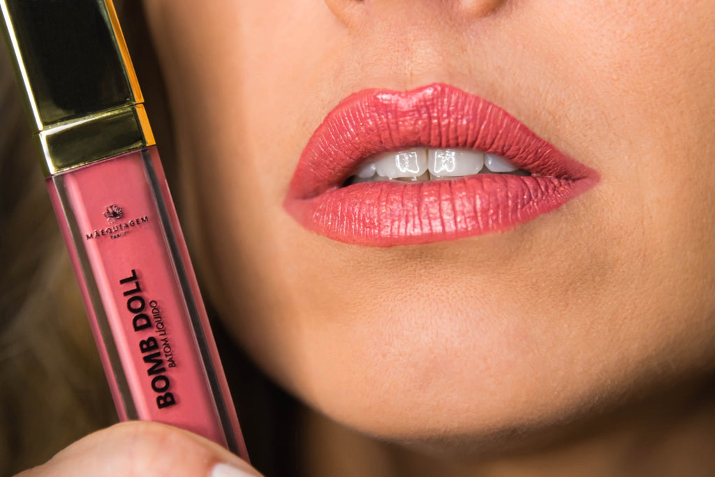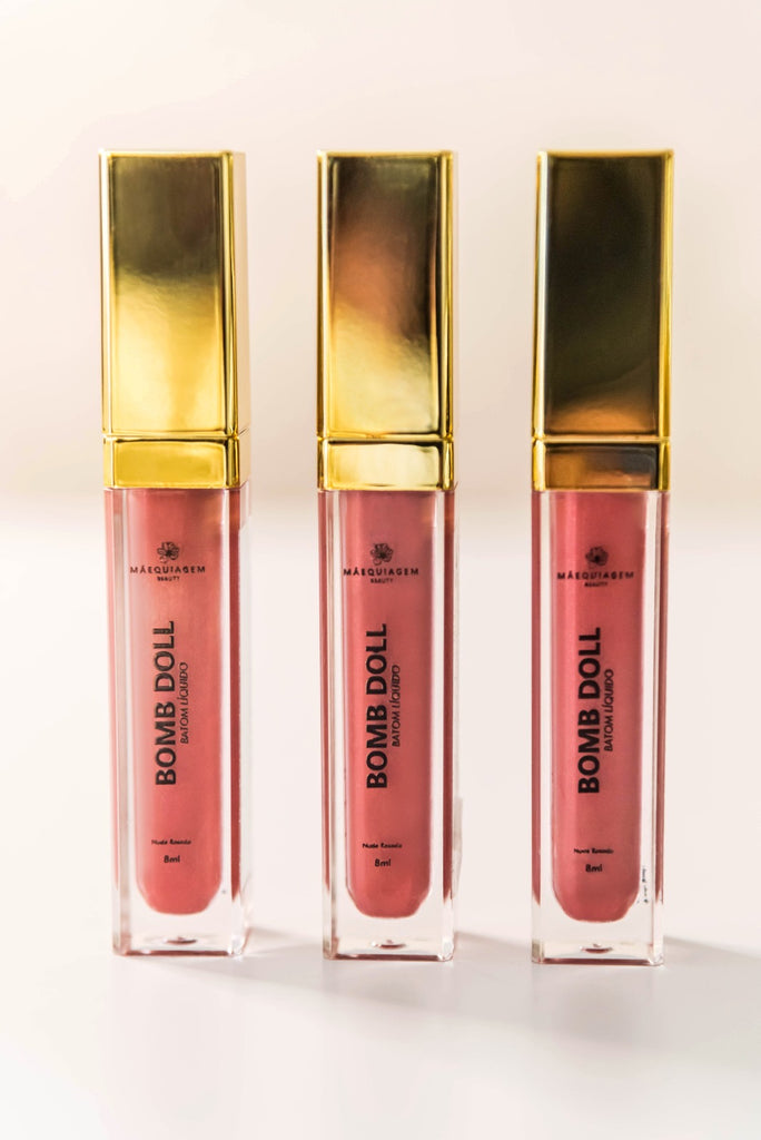 Bomb Doll Batom Líquido na cor Nude Rosado, com nano partículas douradas (quase imperceptíveis) mesclando-se à cor.